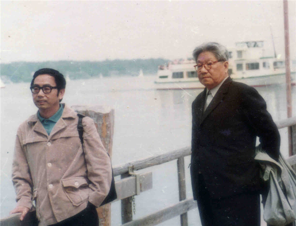 1982年秋,杨武能(左)与导师冯至在德国莱茵河畔留影(资料照片)。新华社发
