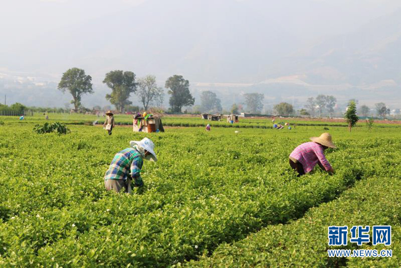 在茉莉花基地里,花农采摘茉莉花(摄于4月24日)。新华网发(杨晓国 摄)