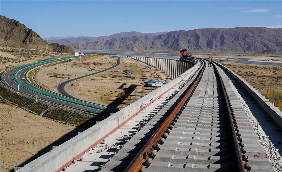 4月下旬,拉萨至林芝铁路全线施工紧张忙碌。林芝火车站正进行站房内外墙装饰;拉萨火车站机辆整备基地改造现场,工人们正在铺设道岔连接线路处枕木等。
