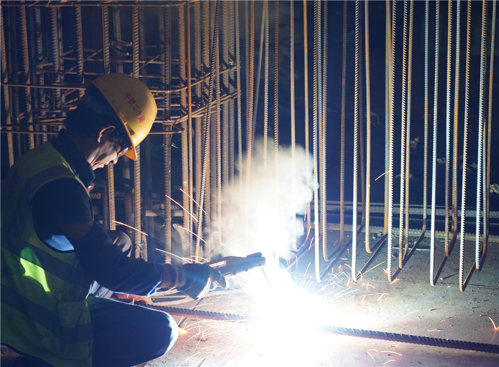 5月1日,工人在昆明地铁五号线广福路西口站现场进行焊接作业。