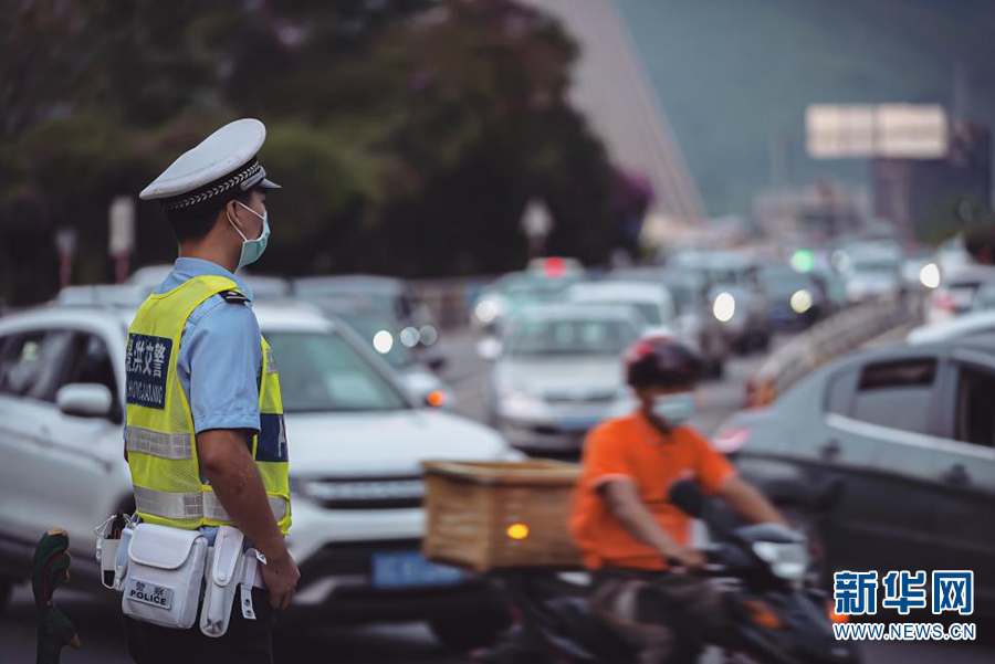 18点,西双版纳大桥旁车流拥挤,交警正在执勤。