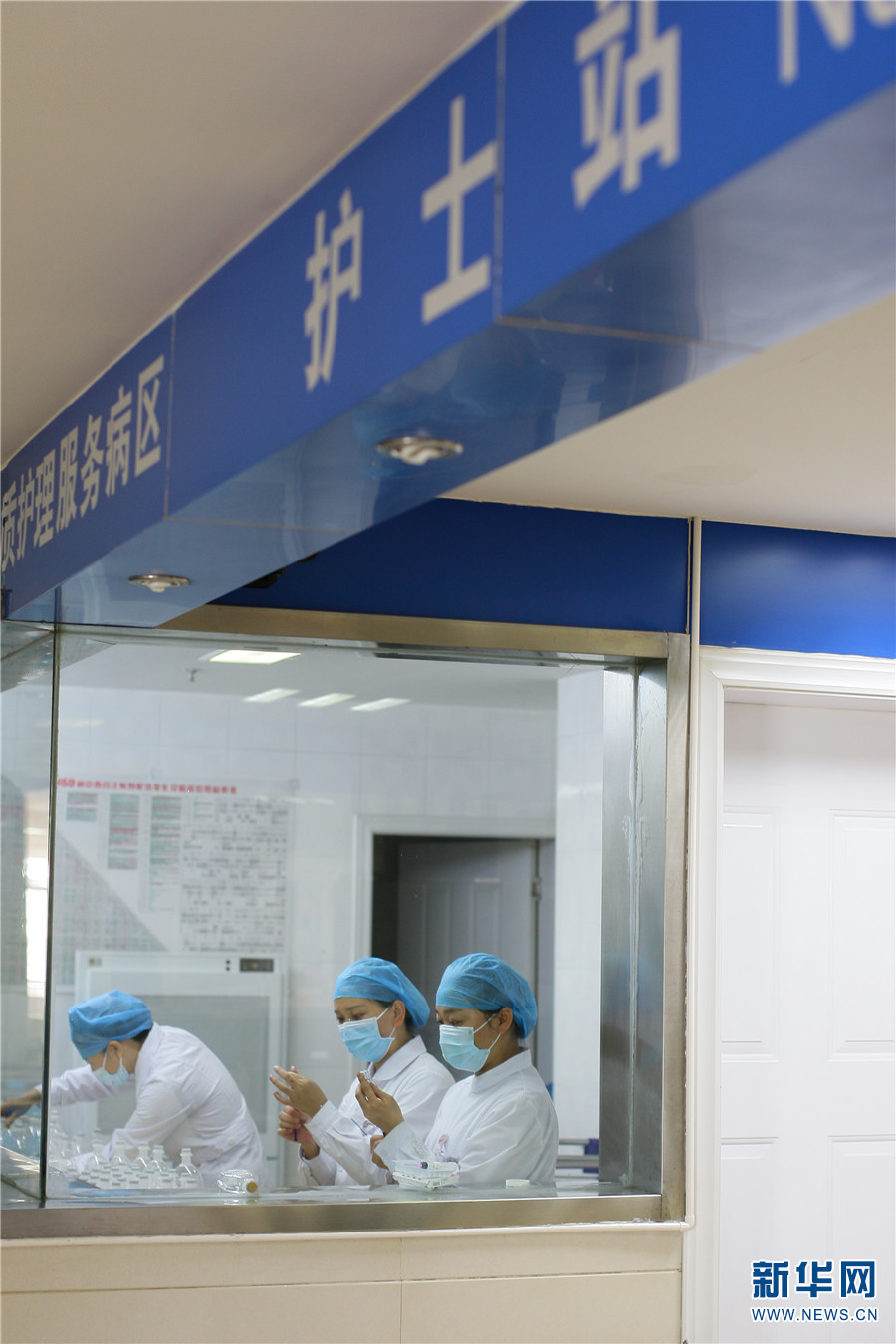2021年5月12日,云南省曲靖市沾益区人民医院外二科,护士长曹雪梅(右)护士陈瑶(左)正在配置药液。