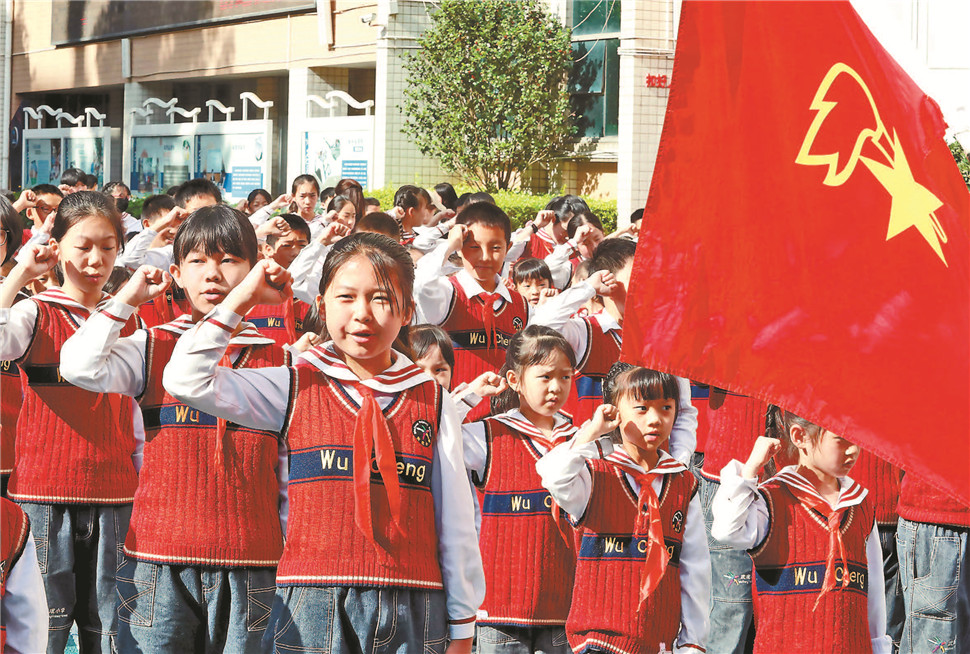 ↑6月1日,武成小学教育集团人民路校区为320名新队员举行庄严的入队仪式。记者 杨峥 摄