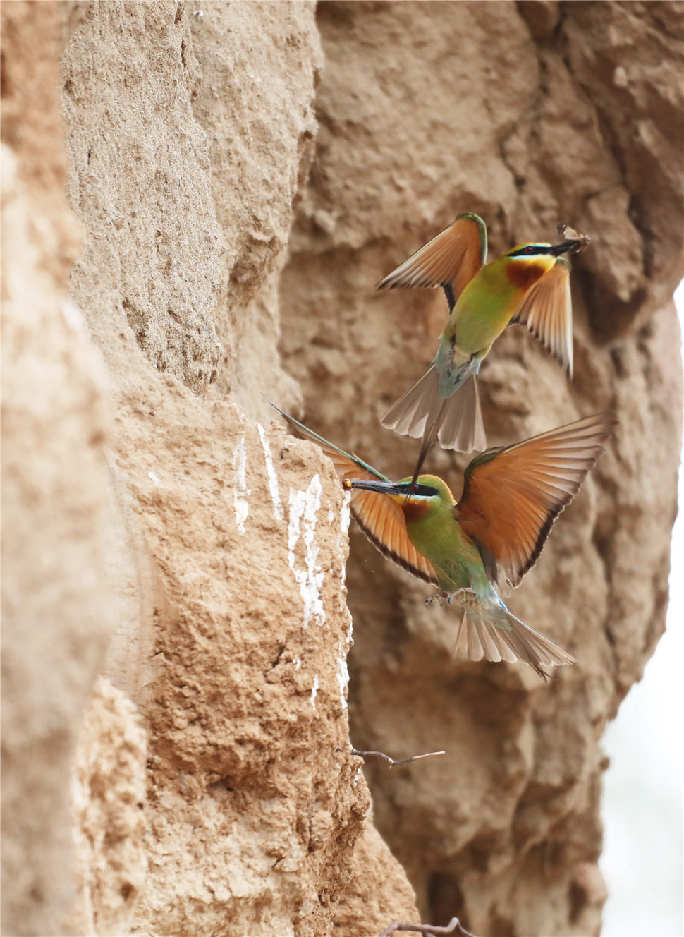 近日,在巧家县多塘镇境内的金沙江边,栖息的栗喉蜂虎有数千只度夏。栗喉喉蜂是蜂虎科蜂虎属的鸟类,是一种热带候鸟,喉部呈栗红色,有黑色的过眼纹,翅膀和背部为绿色,尾翼为蓝色,飞行时翅膀下面的羽毛为橙黄色。在阳光的照射下,全身闪烁着金属般的艳丽光泽,是最美的鸟之一。