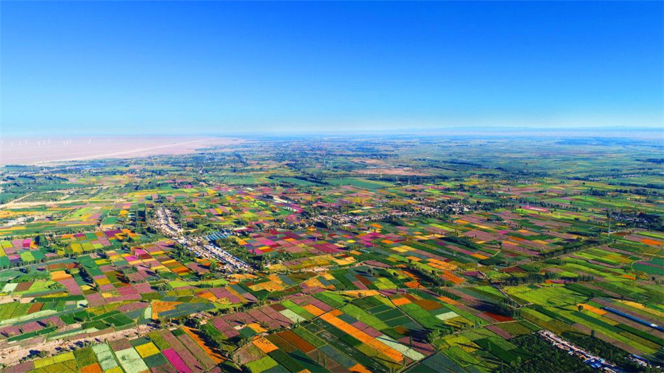 受疏勒河昌马灌区灌溉的作物,如五彩斑斓的画卷。王亚虎摄