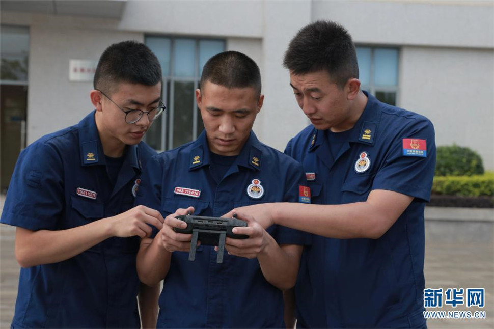 高强(中)正在和同事一起操纵无人机(摄于7月27日)。新华网 刘东 摄