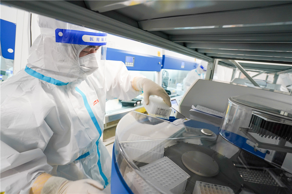 工作人员在“猎鹰号”硬气膜实验室样本处理区内作业(8月14日摄)。新华社记者 李博 摄