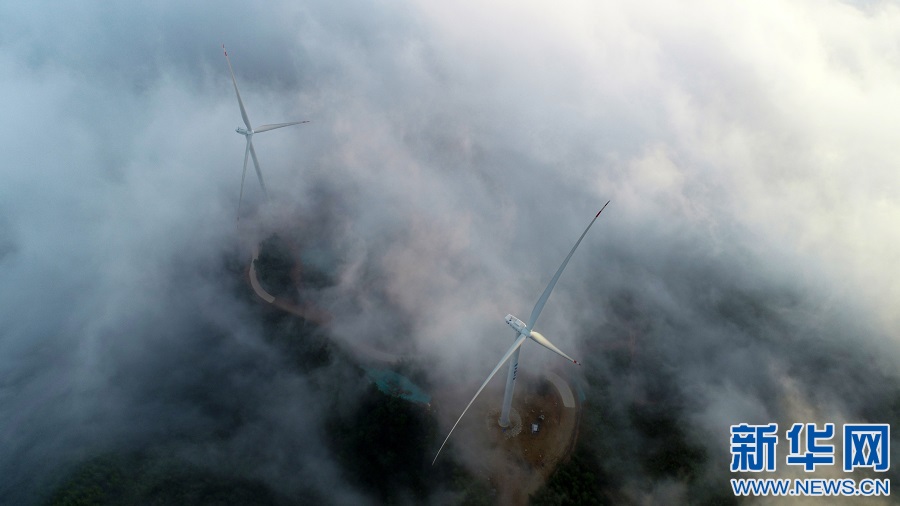 一台台风力发电机矗立在群山之巅,云雾缭绕,美不胜收。新华网发 邓龙华 摄