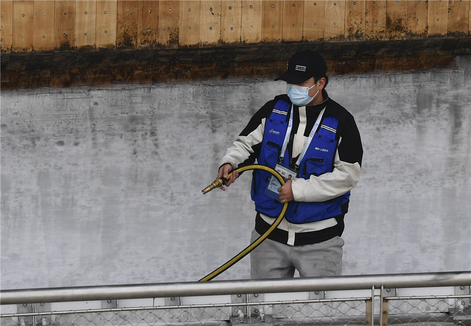 10月25日,工作人员在比赛间隙进行赛道维护作业。