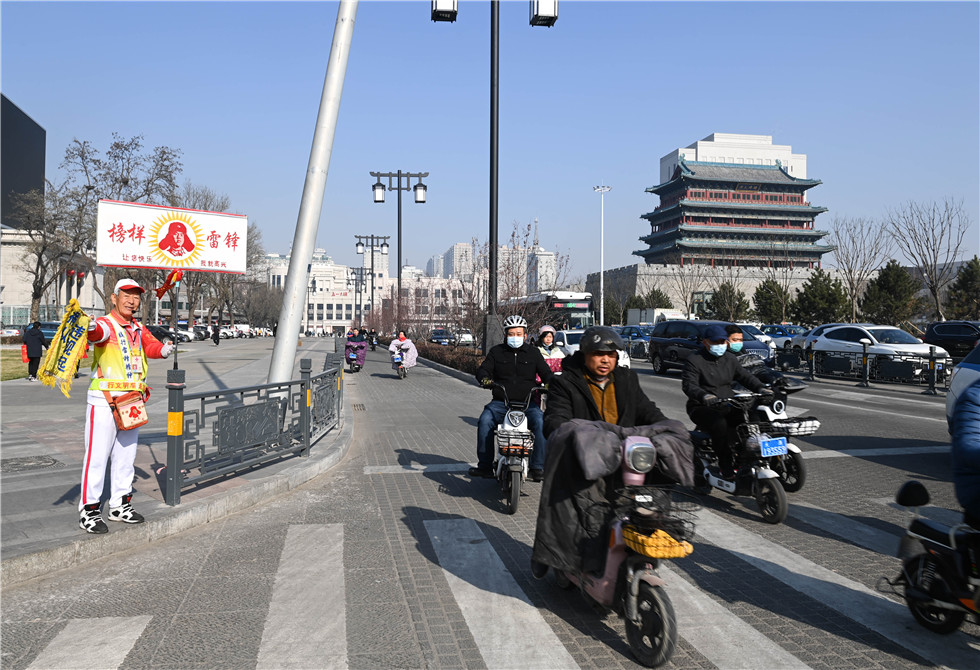 11月17日,在山西省太原市五一广场西北路口,马金明在路旁疏导交通。