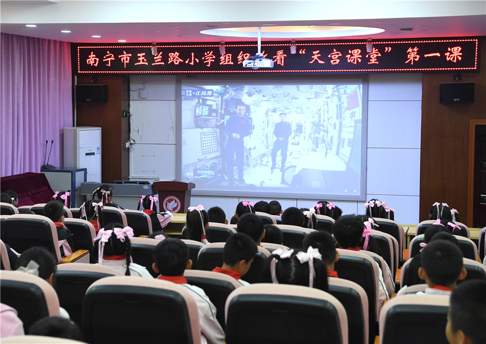 12月9日,广西南宁市玉兰路小学学生在收看“天宫课堂”第一课。