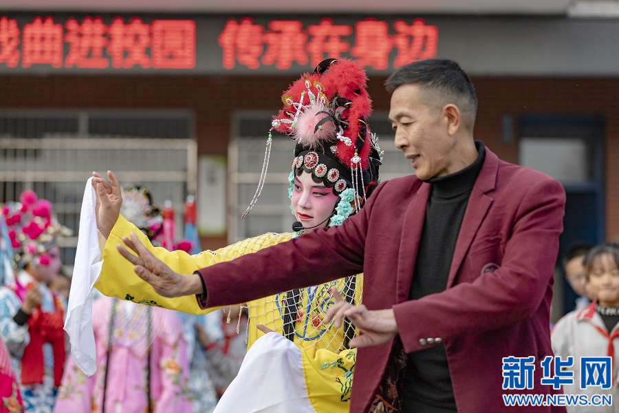 12月10日,在江西省庐山市蛟塘镇中心小学,学生们在非遗传承人的指导下练习国家级非物质文化遗产西河戏。