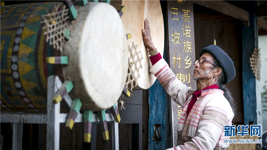 白腊先与他制作的基诺大鼓。新华网 丁凝 摄