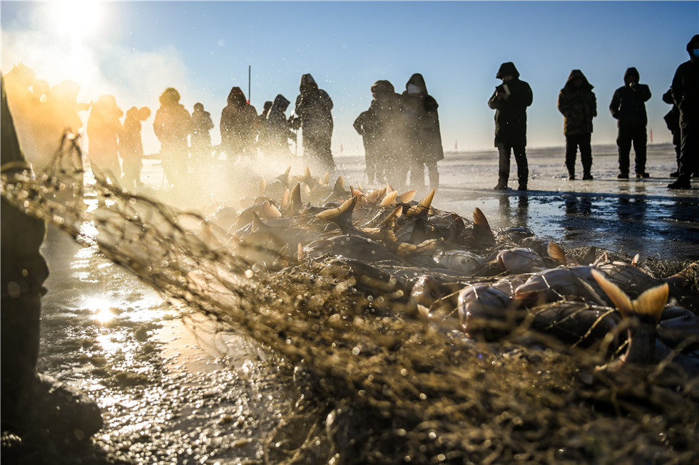 12月26日,游客在查干湖冰面上近距离观看冬捕盛况。