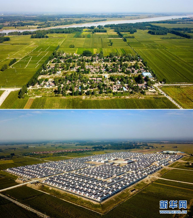 拼版照片:上图为即将要迁建的菏泽市鄄城县旧城镇王庄村(2020年9月20日摄,无人机照片);下图为菏泽市鄄城县旧城镇王庄村即将要整体迁入的六合社区(三合村村台)(2020年9月20日摄,无人机照片)。新华社记者 郭绪雷 摄
