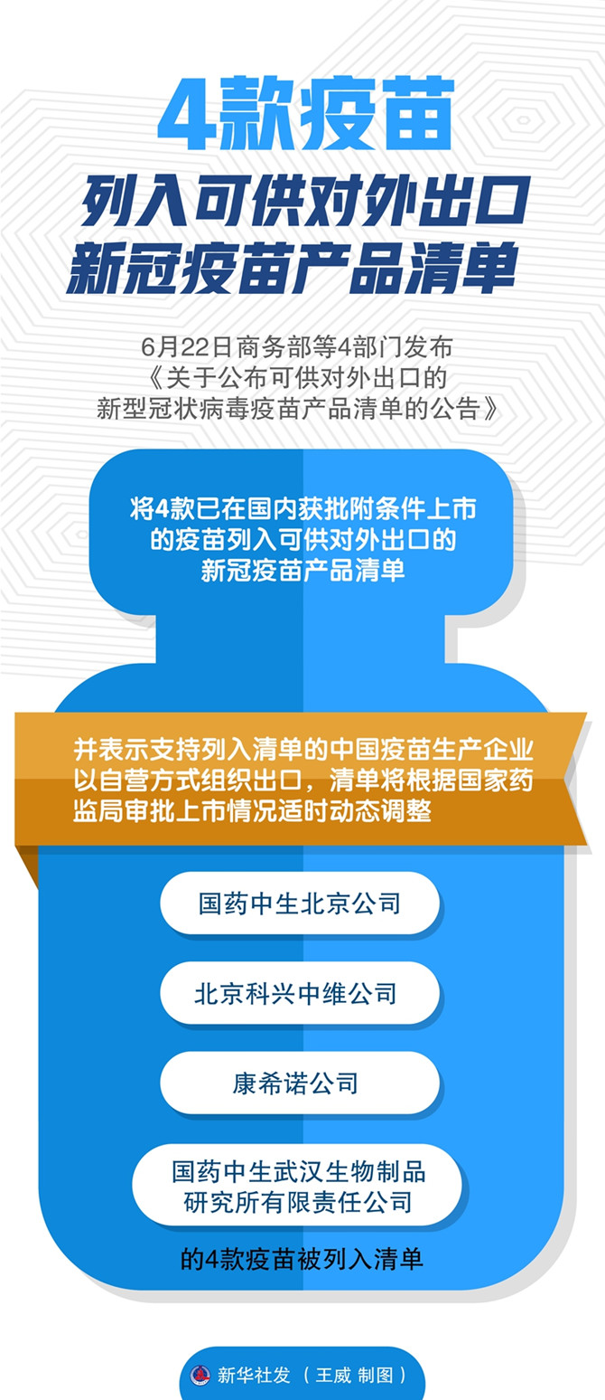 为进一步支持各国抗击疫情、全面扩大疫苗国际合作,商务部会同工业和信息化部、国家卫生健康委、国家药监局发布《关于公布可供对外出口的新型冠状病毒疫苗产品清单的公告》。其中,国药中生北京公司、北京科兴中维公司、康希诺公司、国药中生武汉生物制品研究所有限责任公司的4款疫苗被列入清单。
