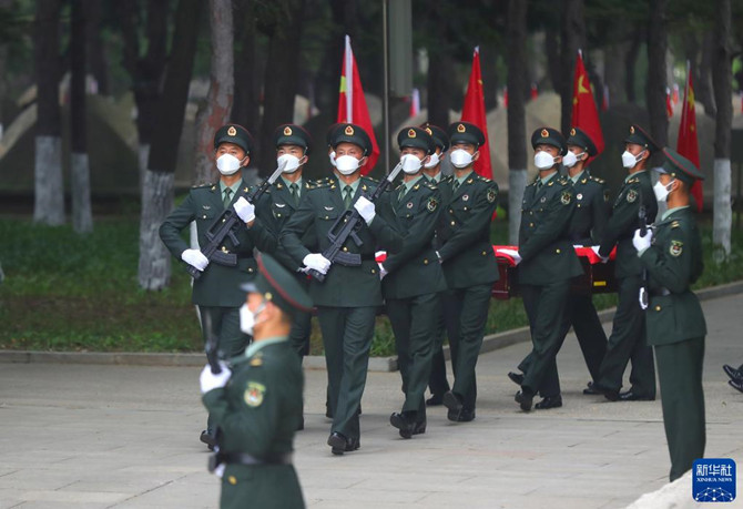 9月3日,礼兵护送志愿军烈士遗骸棺椁进入沈阳抗美援朝烈士陵园。新华社记者 杨青 摄