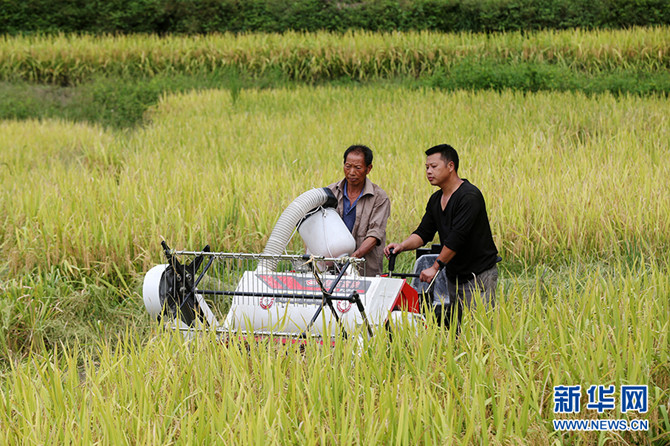 先富不忘乡亲。在脱贫攻坚期间,冉龙江还招收了3名贫困户来自己的家庭农场工作,让他们在家门口就能挣钱,帮助他们实现了稳定脱贫。图为冉龙江和父亲使用收割机收割水稻。新华网发(杨敏 摄)