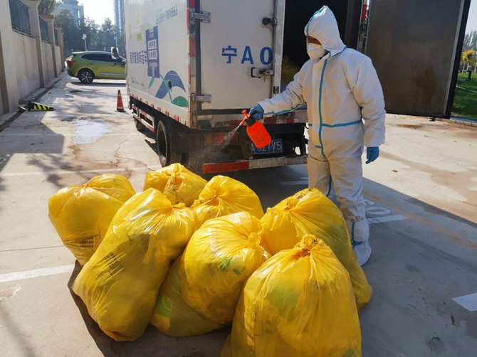 工作人员正在对打包好的医疗废物进行消毒。 新华社记者许晋豫 摄