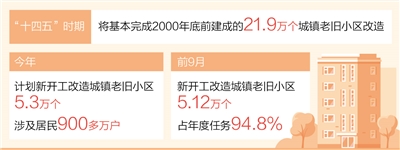 “十四五”开局之年,我国计划新开工改造城镇老旧小区5.3万个,涉及居民900多万户。住房和城乡建设部发布数据显示,今年前9月,全国新开工改造城镇老旧小区5.12万个,占年度目标任务的94.8%。