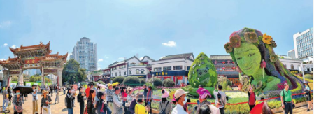 翠湖南门的“彩云之南”立体花坛,将云南特有的大象、绿孔雀、滇金丝猴以及马缨花、海菜花、地涌金莲、蕨类等动植物配置于景观之中,展现云南生物多样性保护的成果;
