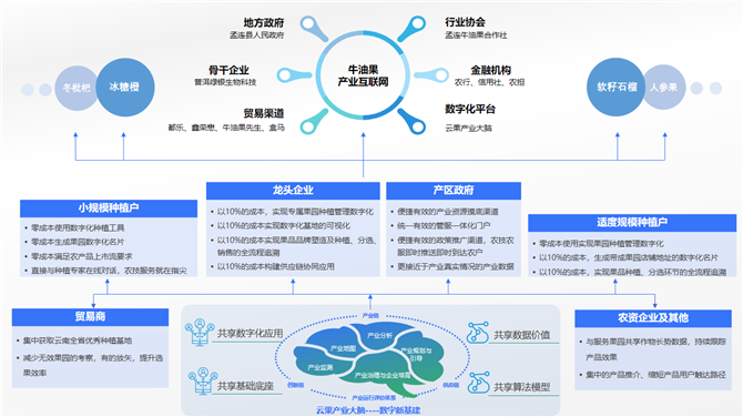 今年9月,“云果产业大脑”项目入选了2021年云南省“10大数字农业优秀应用平台(系统)”名单。“云果产业大脑”项目的建设方之一国家高原云果产业园董事长孙月秋介绍:“一个企业要想打造和运营一个单品数字化布局、行业协同发展、科技赋智的平台,需要花费巨额成本,且未必能达到想要的效果。但是,通过地方政府、行业龙头企业、行业协会、金融机构、科研机构、科技开发企业等多方发力构建的产业互联网,它不仅能提高全产业链生产效率、提升产业产品价值,还能以更低的成本更好地解决这些需求。”