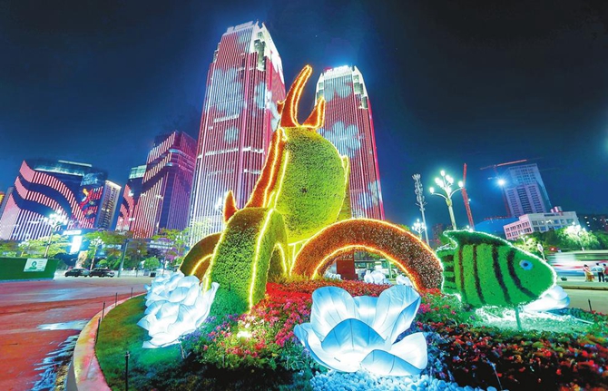 灯光璀璨、花团锦簇的昆明街头。记者 黄兴能 陈飞 摄