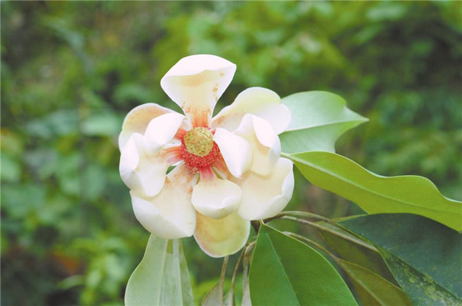 华盖木为上层乔木,根系发达,有板根,树冠优美,犹如伞盖,树叶四季常绿,嫩叶呈赭红色,花期在每年4月至5月,果熟9月至11月,是国家一级保护植物,被称为“植物大熊猫”。据了解,它起源于1.4亿年前,是木兰科中最古老的单属种植物之一,具有极高的科学研究价值和观赏价值。