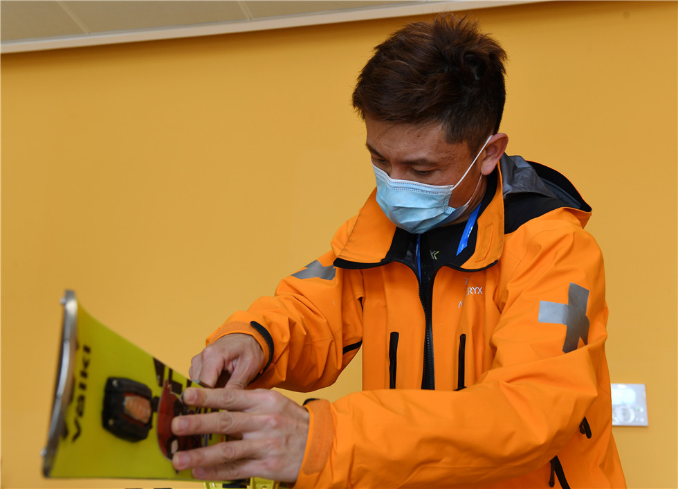 这是2021年2月21日,国家高山滑雪中心医疗队医生怀伟在北京冬奥会和冬残奥会测试活动期间保养自己的滑雪板。