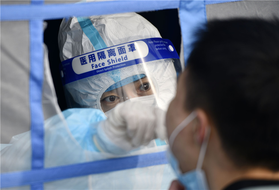 1月9日,在天津滨海高新区的一处核酸检测点,工作人员在为群众做核酸采样。新华社记者 赵子硕 摄