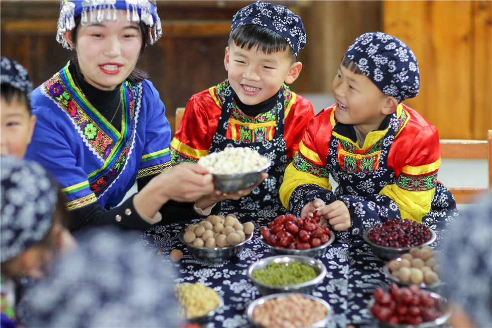 1月10日,贵州省铜仁市玉屏侗族自治县一幼儿园的老师在指导小朋友辨识熬制腊八粥的食材。