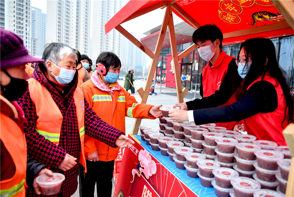 1月10日,在安徽省亳州市谯城区,志愿者为环卫工人送上腊八粥。