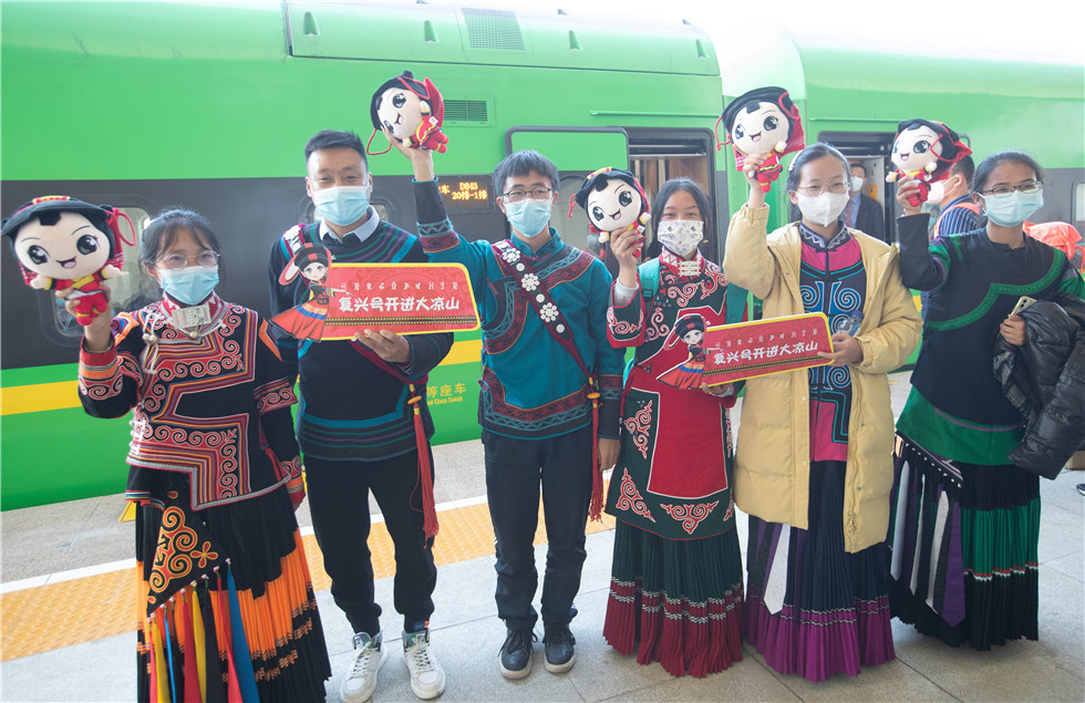 1月10日,在西昌西站,以前赶“慢火车”上学的喜德县中小学生代表在D843次复兴号动车组前留影。新华社记者 江宏景 摄