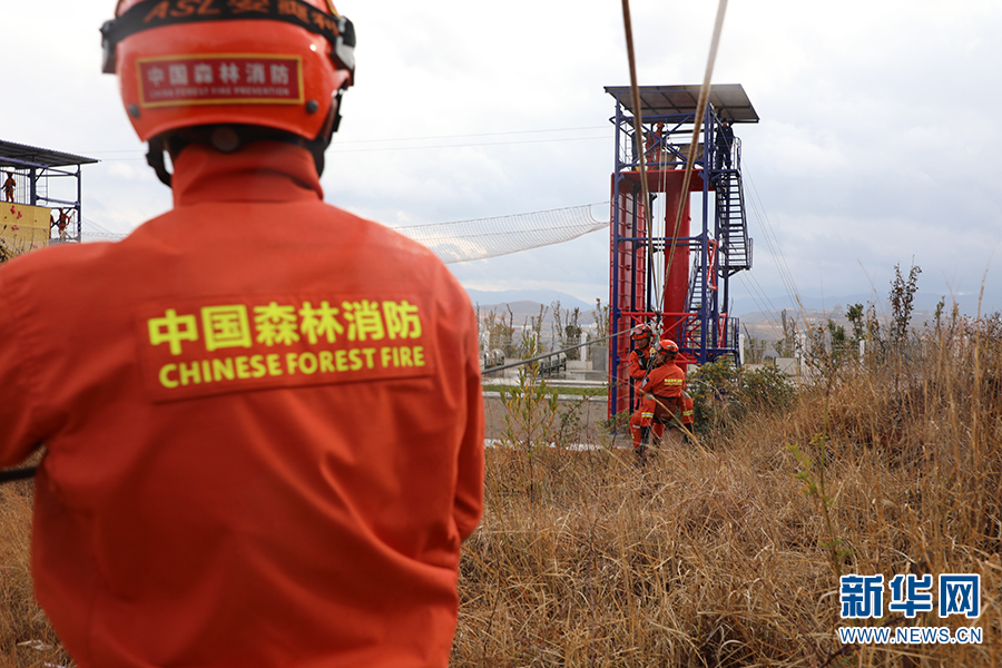 高空绳索救援技术训练 (1月13日拍摄) 。新华网发(大理州森林消防支队供图)
