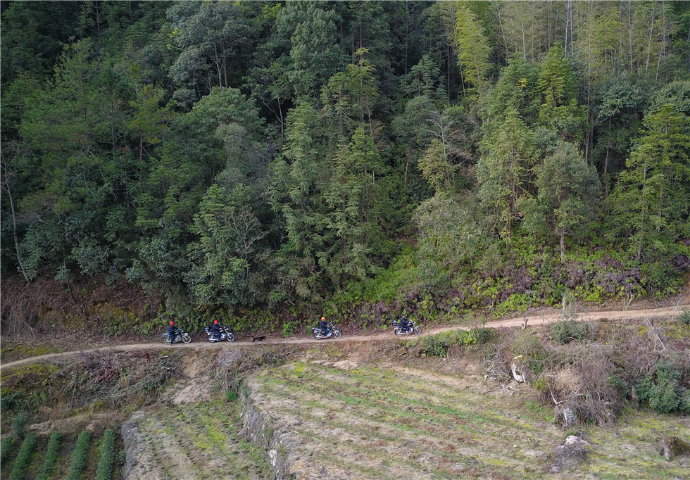 1月19日,武夷山国家公园护林员骑摩托车前往巡山(无人机照片)。