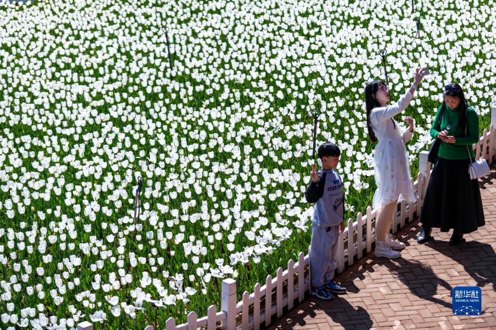 2月10日,游客在昆明捞鱼河湿地公园内观赏郁金香。 新华社记者 陈欣波 摄