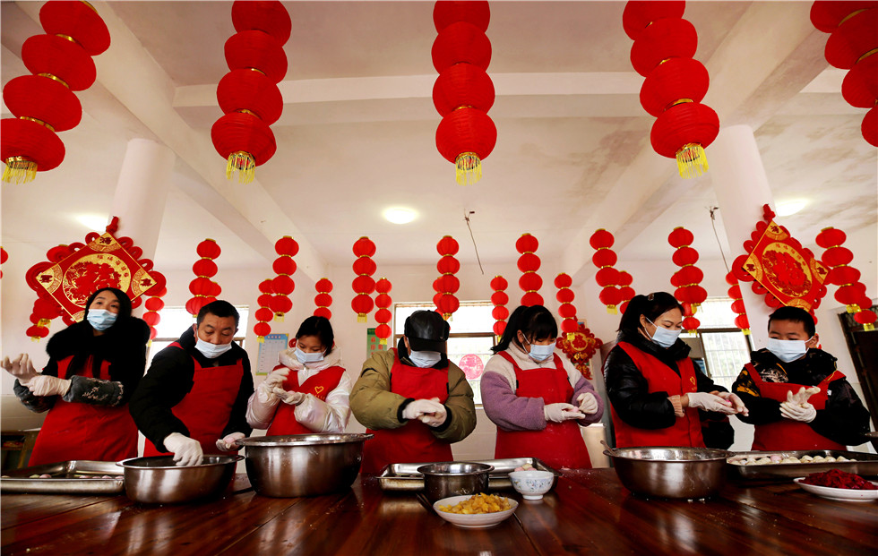 2月13日,在江西省宜春市靖安县仁首镇石上村幸福食堂,志愿者和孤寡老人、留守儿童一起包汤圆。
