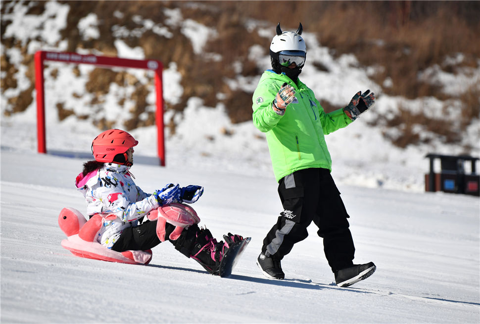 2月15日,在鳌山滑雪场初级雪道上,一名教练(右)在指导学员练习动作。