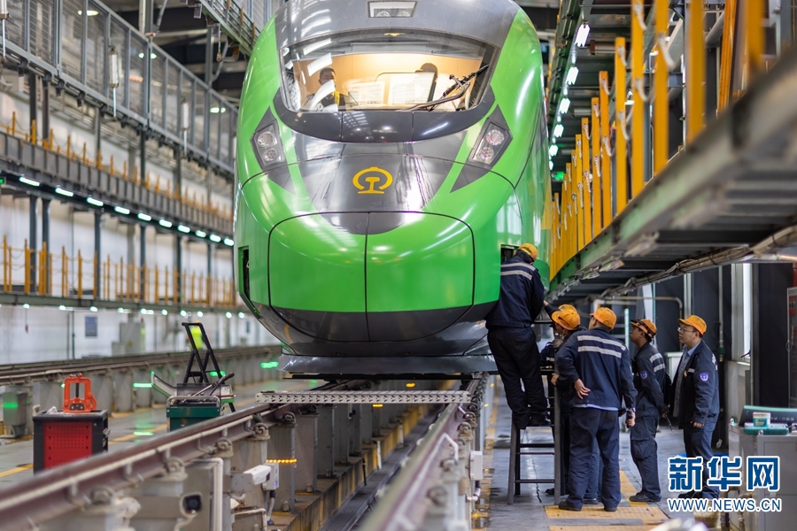 工作人员对列车进行检修。新华网发(蒋忠良/摄)
