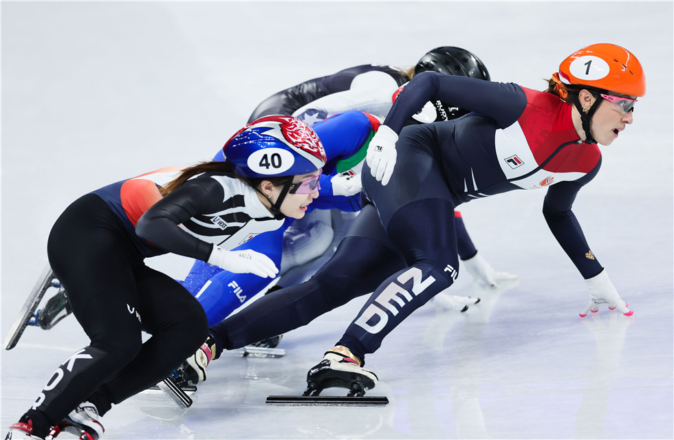 2月11日,荷兰队选手苏珊娜·舒尔廷(右一)在北京2022年冬奥会短道速滑项目女子1000米决赛中夺得冠军。