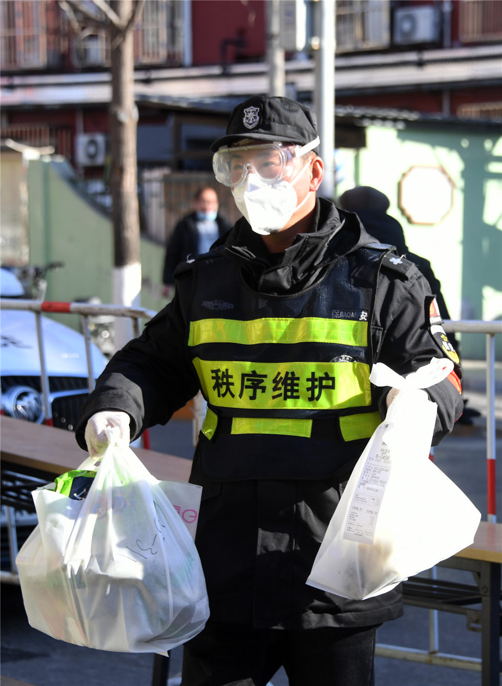 2月22日,在志强北园小区外,工作人员帮助居民运送订购的物品。