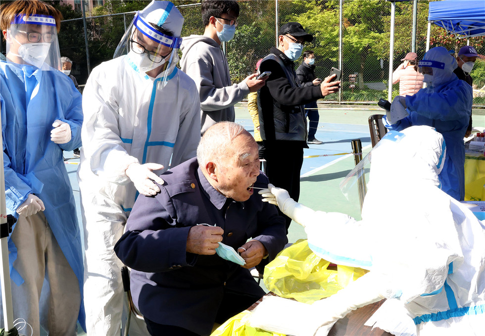 4月4日,87岁的虞祖荣老人在志愿者的协助下进行核酸检测采样。