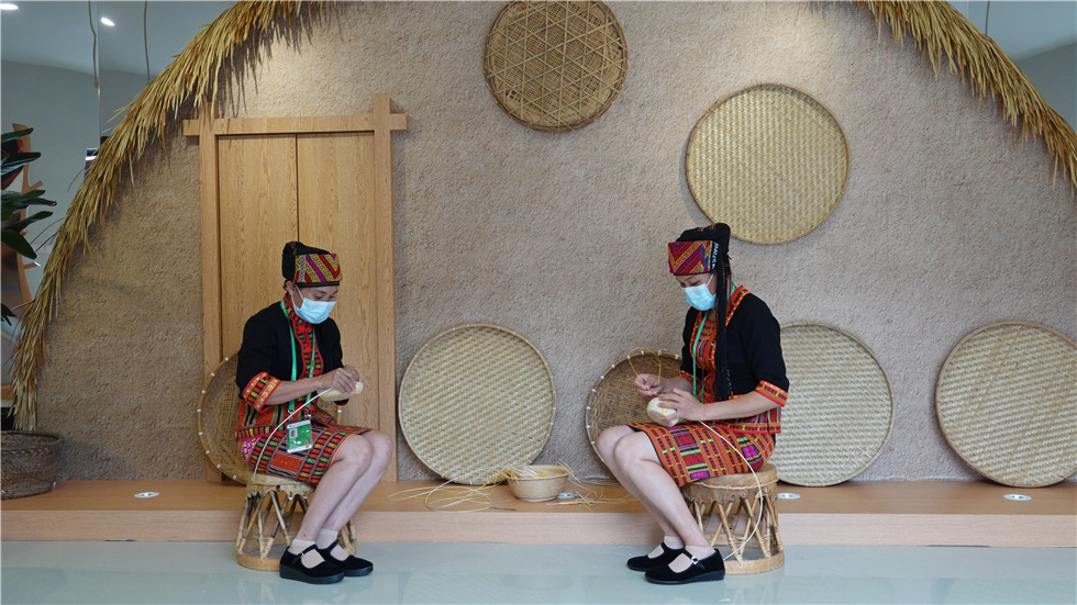 4月21日,黎族妇女在“寻觅雨林·万物共生”热带雨林文化展上展示黎族藤编。 新华社记者 丁洪法 摄