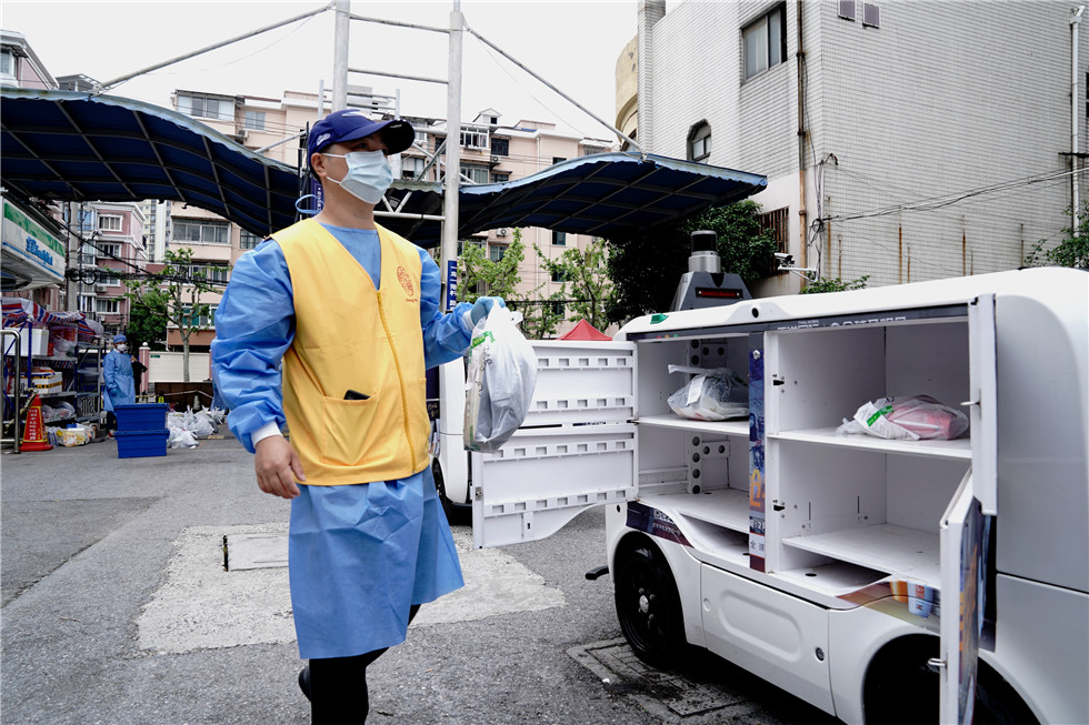 4月25日,杨浦区长海路街道浣纱小区的党员志愿者将小区大门口的快递放入无人快递车。