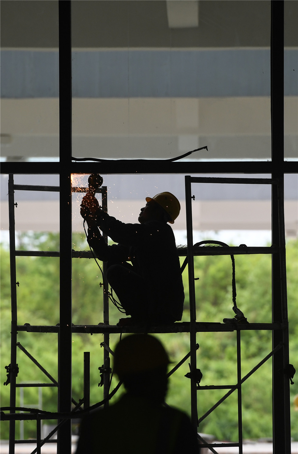5月1日,在广西南宁至崇左铁路崇左南站,中铁十一局建设工人在施工作业。