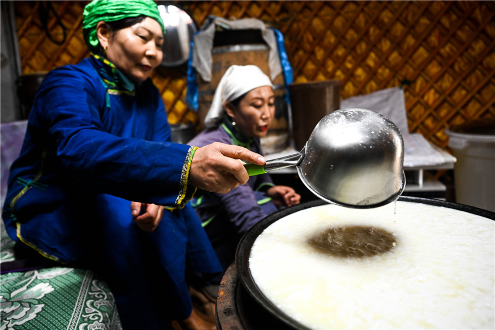 4月27日,在正蓝旗吉胡兰图嘎查,陶高(左)和阿拉腾扎格苏用传统手艺制作奶豆腐。