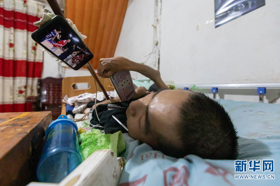 云南省大理白族自治州云龙县宝丰乡金麦村青草屋小组,大山顶上,全村最高处的一户农家小院里,饶万春仰面躺在床上,双眼盯着斜上方用竹棍和卷筒纸固定着的手机,右手撑着一个铁制文具盒,用电容笔在手机上敲下一段段文字。