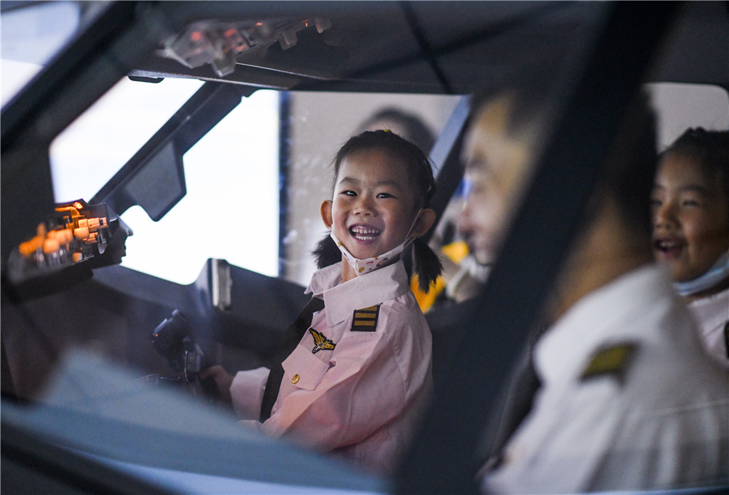 6月19日,在南航新疆基地,来自乌鲁木齐市金太阳幼儿园的刘灼曦(左)在飞行教员的指导下,体验双座737IPT程序模拟机飞行。