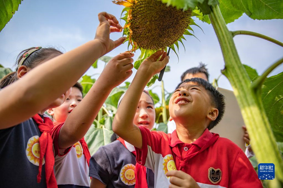 6月22日,在重庆两江新区星湖学校教学楼顶的向日葵园,学生们在向日葵全融合趣评嘉年华测评中采集向日葵标本。