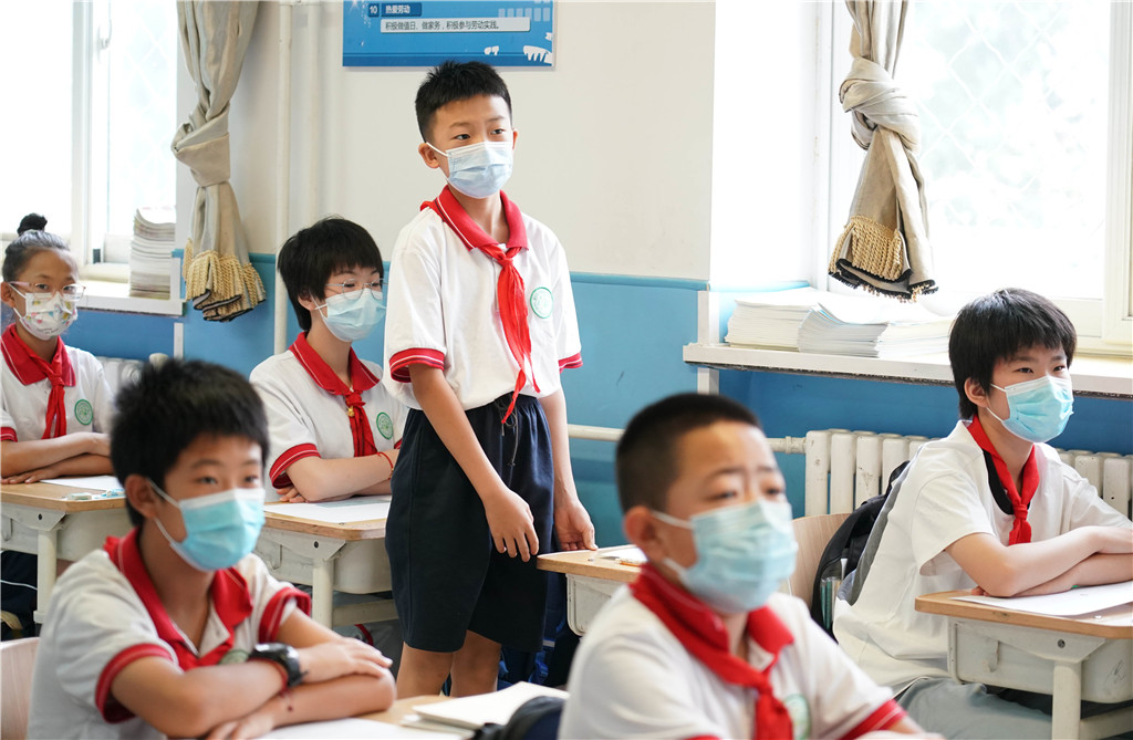 6月27日,在北京第二实验小学平谷分校,五年级(2)班的学生在数学课上回答问题。